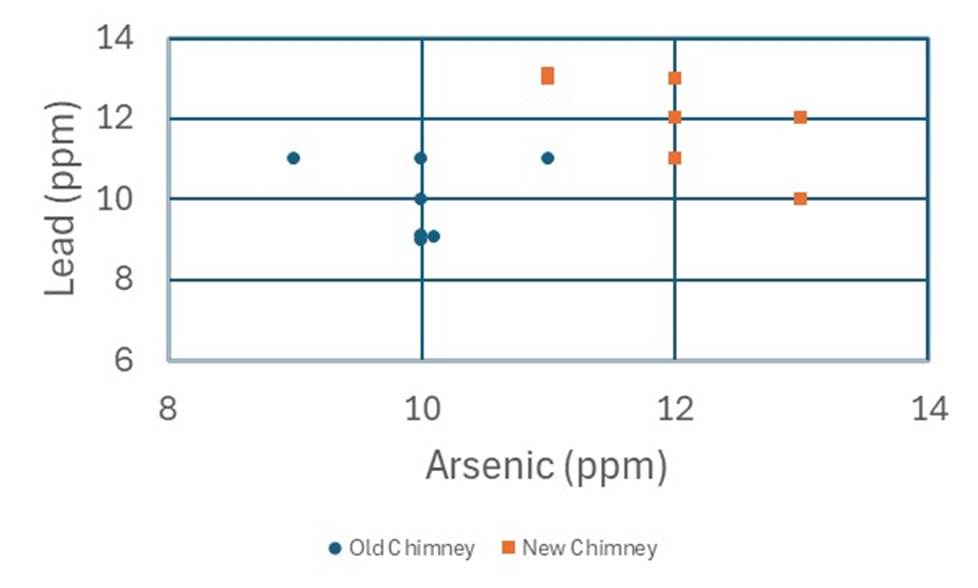POSSIBLE REPONSE: The arsenic data have not changed from Scenario 4, and so the conclusions above still apply, but it might be easier to see the separation between the old and new chimneys when plotted this way. Also, we can see that both arsenic and lead are increased in the newer chimneys, adding confidence to our conclusion that there has been an environmental impact in this area between the two time periods.